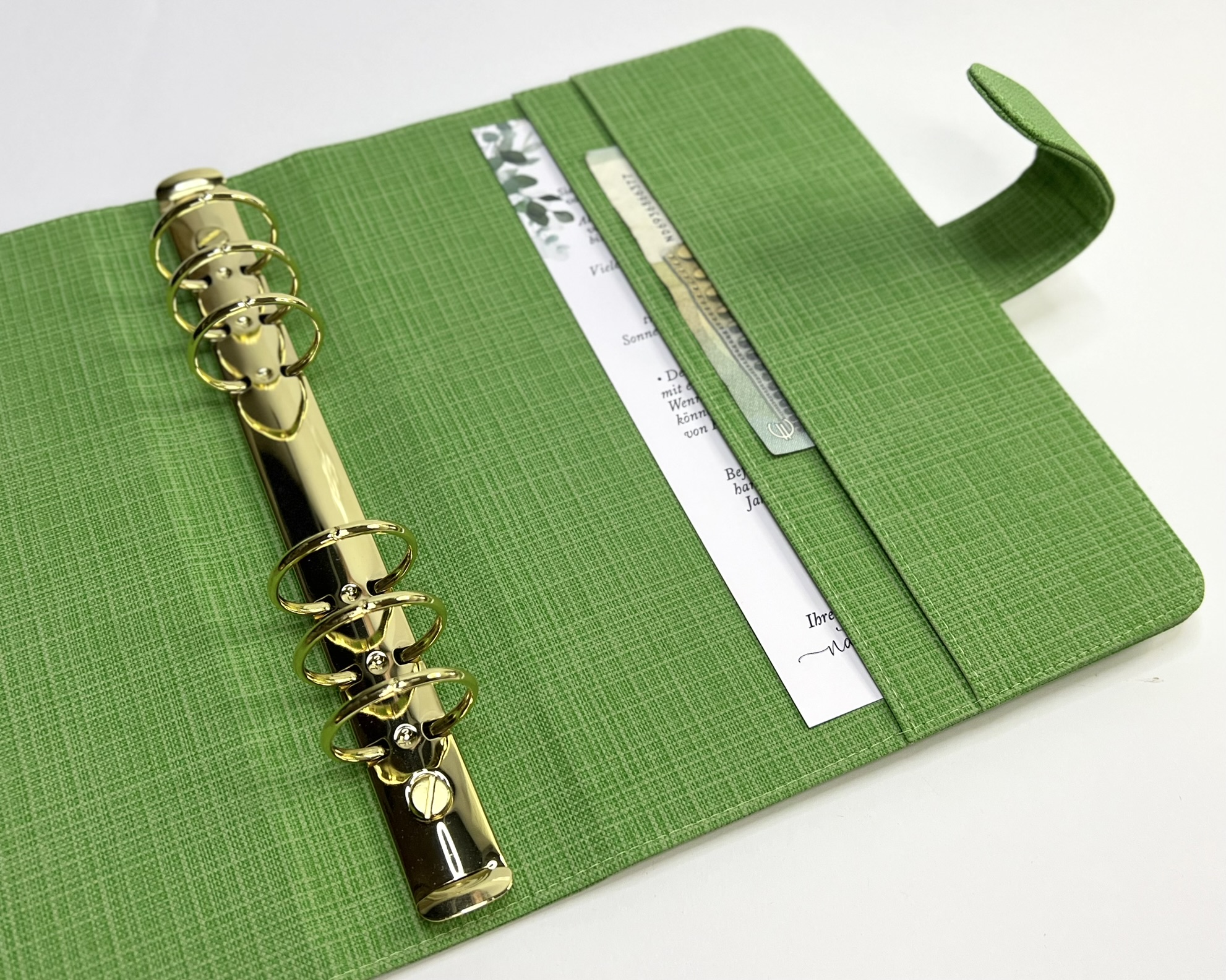 • Innen ist Platz für einen handelsüblichen A5-Ringmechanismus sowie Einlagen, Register und ein paar flache Extras (Sticker, Notizen, Karten)